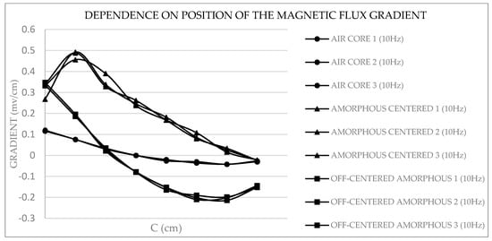 Figure 11 corresponding to the air core, the maximum electromotive force was reached in a position such as in the case of the off-centered amorphous core material, and from this peak, the voltage collected decreased.