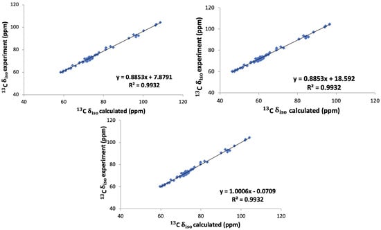 The second disaccharide, trehalose consists of two units of -glucose, each attached via C. The RMSD of the changes in the glucose chemical shifts is similar for both rings in trehalose. For instance, the deviation of an individual carbon atom is large for C, C and C for the first unit. These are actually the same atoms for which the largest changes were observed in both sucrose structures. However, the changes are smaller in trehalose than in sucrose both for these atoms as well as the other ones, thus also resulting in a smaller RMSD than for sucrose. Interestingly, for both disaccharides, it is not the atom that makes the glycosidic linkage, i.e., C, for which the largest change in chemical shift is observed. For the second -glucose unit in trehalose, the changes are large for C, C and C and thus also for the atom involved in the glycosidic linkage.