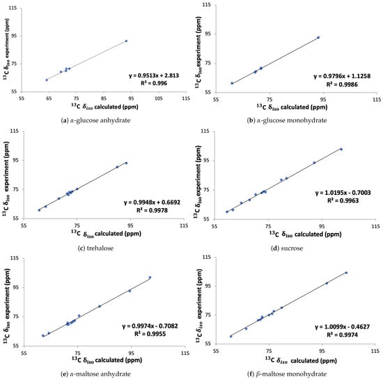 23]. All of these crystals also have an anhydrate crystal structure. We will therefore compare the monohydrate crystals with the anhydrate to see the impact of water molecules on the chemical shifts in mono- and disaccharides. The anhydrate is always the reference component in our comparisons. We start by looking at
