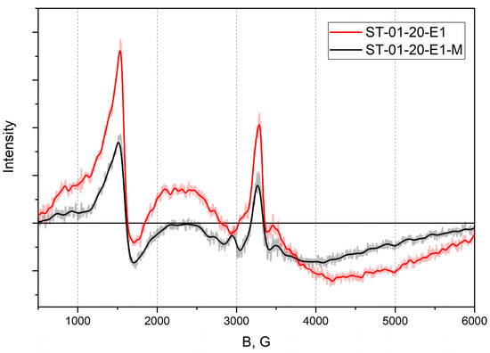 EPR spectra of the samples obtained with the use of the different precursors: the commercially available salt of Fe(NO3)3 (ST-01-20-E1) and the solution of 57Fe in nitric acid (ST-01-20-E1-M).