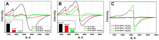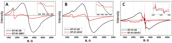 EPR spectra of ST-01 (A), ST-21 (B) and ST-41 (C) samples after depositing Fe3+ ions (black lines) and after etching with HCl (red lines).