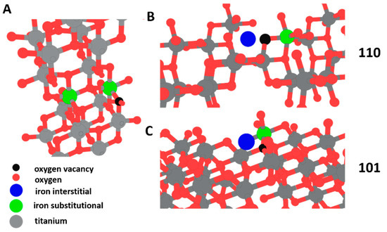 Top and side views of two substitutional iron impurities in core TiO2 with oxygen vacancy between defects (A) and pair of substitutional and interstitial Fe impurities in the vicinity of oxygen vacancy in (110) and (101) surfaces, (B) and (C), respectively. Not all bonds are shown.