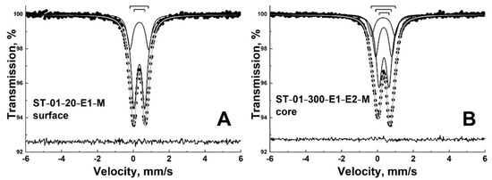 Figure 6 displays the 57Fe Mössbauer spectra of ST-01-20-E1-M and ST-01-300-E1-E2-M samples measured at room temperature and fitted by the superposition of partial contributions.