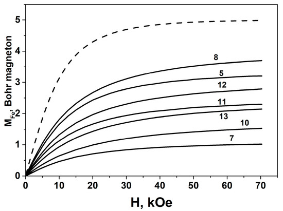 Magnetization curves of samples with different contents of iron. The numbers of the curves correspond to the samples’ numbers in Table 1. The dash line denotes the Brillouin function for the spin S = 5/2.