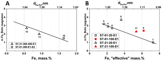 It would be incorrect to use the total content of iron directly in the case of surface doping because iron ions were distributed on the surface only rather than over the whole core. However, if one sets a certain thickness of the surface layer, for example, close to the interatomic distance of 0.3 nm, then one can introduce the term “effective mass concentration” in this surface layer, taking into account the surface area of the particles. Increasing the thickness of surface layer, say, by a factor of two or three, would not change the result qualitatively, i.e., the tendency for the magnetic moment to decrease with growing iron content remains. Figure 8B displays the data from Table 1 confirming this, and, for these samples, it is on the surface that iron ions are deposited. It should be pointed out once again that, in this case, the “effective” concentration was rather conditional and was inversely proportional to the given thickness of the layer. It is important that changing the scale along the concentration axis would not affect the general tendency: as the concentration increased, the average magnetic moment continued to decrease. The deviation from this behavior of the magnetic moment observed for sample No.9 (ST-01-100-E1) was, probably, a result of the redistribution of iron ions upon annealing. Although all such ions remained on the surface, they may be etched out by dithionite and either move to the second layer (which can also be reachable for dithionite etching) or distributed more uniformly over the first layer, thus decreasing the likelihood of interaction. For the samples No.8 and No.11 of ST-21 series, a considerable deviation should be noted in the value of the magnetic moment as compared to the behavior observed for the samples of ST-01 series. The catalytic properties of TiO2 ST-01 and TiO2 ST-21 are known to differ rather strongly [20]. Possibly, this is caused by differences in the surface structure, which can also influence the disposition (the clustering rate or non-homogeneous distribution) of Fe ions on the surface.