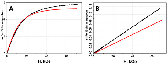 It can be seen from Figure 9A,B that for the specified mix of spins, even with a relatively large fraction of the low-spin states, the sum of two Brillouin functions had a slope too low in the high magnetic fields, which contradicted the experiment. At room temperature (Figure 8B), this discrepancy was even greater. Additionally, as seen from Figure 8B, with the surface doping with iron ions, the value of magnetic moment may vary within a considerably wider range from 3 µB down to 1 µB, which is rather indicative of another mechanism of magnetization reduction.