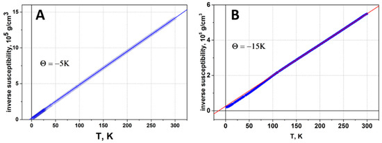 Figure 10A,B displays the temperature dependences of the inverse susceptibility—1/χ(T)—for the samples with the surface (A) and core (B) doping. The Curie constant C and the effective magnetic moment are determined from the slope of 1/χ(T); the intercept on the abscissas axis determines the Weiss constant (θ) for the case of interacting carriers of magnetic moment. The Weiss constant θ amounts to −5 K and −15 K for the samples ST-01-20-E1 and ST-01-300-E1-E2, respectively, which indicates the presence of negative exchange interactions in the system. Note that the value of θ is determined with a rather great error, a few degrees K at least, so we would not speculate about the difference in these values for the specified samples.
