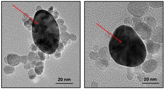 TMAH plays an essential role as a capping agent, required for the reduced gold to coat the surface of magnetite NPs, as it can be replaced through ligand exchange with another capping agent, such as sodium citrate [44,45]. The absence of capping agents might lead to a mixture of coated and uncoated particles or the formation of AuNPs separately, as the magnetite NPs surface is unavailable as a nucleation site. The obtained magnetite-gold system without using TMAH as a capping agent was characterized by TEM micrographs, which are summarized in Figure 3.