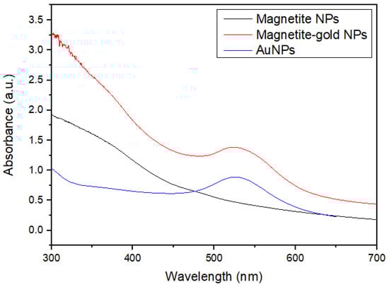 UV-Visible spectroscopy was performed to ascertain the presence of the surface plasmon resonance (SPR) band in the synthesized magnetite/gold NPs. The UV-Visible spectra of magnetite/gold NPs were compared to that of bare magnetite and bare AuNPs, summarized in Figure 6. An absorption peak was not observed for magnetite NPs in the visible range. The characteristic SPR of bare AuNPs was observed at 520 nm, consistent with AuNPs exhibiting a mean size diameter of 10–15 nm (for further details on bare AuNPs, see Appendix C). An SPR band was also present in the magnetite/gold NPs, with a bathochromic shift from 520 to 530 nm and a broadening of the absorption band, which can be attributed to the interaction between the core and shell interfaces and changes in the NPs surface [22,48,49]. Bathochromic shifts are related to changes in the dielectric constant and interaction among nanoparticles, which can be ascribed to quantum-size effects and a higher electronic density provided by the gold coating in the modified nanostructures. This is consistent with a magnetite/gold interface rather than a magnetite-gold composite [39,49].