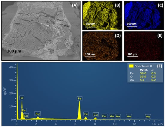 The FE-SEM and EDS characterization techniques analyzed the morphology and the deposition of magnetite/gold NPs onto the as-synthesized βCDNSs. Figure 7A exposes the rough surface of βCDNSs, consistent with the structure previously reported for βCD polymers synthesized with DPC as cross-linking agent [29,52,53,54]. Characterization employing EDS mapping analysis evidenced the presence of C, O, and Fe in the organic substrate and the uniform distribution of magnetite/gold NPs all over the βCDNSs (Figure 7B–D, respectively). The localization of Au, using EDS mapping (Figure 7E), provides evidence that the core-shell interface is preserved upon immobilization onto the organic polymer, suggesting that most of the magnetite NPs were coated with gold. The EDS spectra of the βCDNSs-magnetite/gold system revealed its elemental composition and the presence of O, Fe, and Au (Figure 7F).
