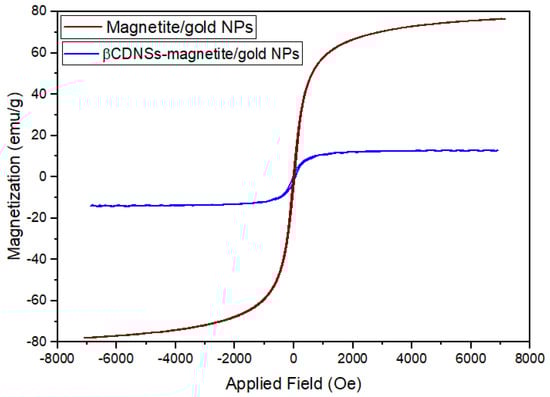 The magnetization saturation of the βCDNSs-magnetite/gold system was evaluated to determine if the magnetite/gold NP’s superparamagnetic nature is preserved upon association with the cyclodextrin polymer. Figure 9 depicts the hysteresis curves of magnetite/gold NPs and the βCDNSs-magnetite/gold system. VSM analysis shows that both systems present superparamagnetic behavior, with coercivity and remanence values near zero. However, the comparison of the curves demonstrated that the magnetization saturation drastically decreased concerning bare magnetite/gold NPs (78.3 emu/g) upon immobilization into the βCDNSs polymer (17.7 emu/g) due to the diamagnetic nature of the latter [43,52].