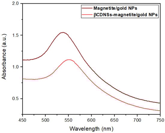 UV-Visible spectroscopy was performed to elucidate the presence of the SPR band in the βCDNSs-magnetite/gold system. The maximum absorption band in βCDNSs-magnetite/gold NPs was observed at 560 nm, evidence of a bathochromic shift from the 530 nm absorption band in the magnetite/gold NPs (see Figure 10). The red-shifted displacement of the SPR band could be attributed to the changes in the magnetite/gold NPs’ chemical environment and their dielectric constant. The deposition of the NPs onto the βCDNSs matrix, dispersed and aggregated in the organic substrate, as observed in the TEM micrographs (Figure 8A), might also promote a broadening and shifting of the SPR [30,57].