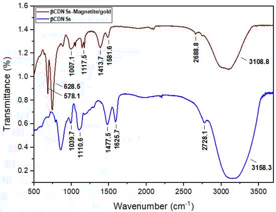 FT-IR spectra of βCDNSs and βCDNSs-magnetite/gold NPs were determined to ascertain the interactions of the core-shell system with the polymer, as shown in Figure 11. FT-IR spectra of bare βCDNSs evidenced vibrational bands of 1039 cm−1 (C-O-C, stretching), 1100 cm−1 (OH, bending), 1477 cm−1 (C-H, bending), 2728 cm−1 (C-H, stretching), 3158 cm−1 (OH, stretching), and 1625 cm−1 (C=O, stretching). The observed vibrational spectra indicated that the βCDNSs bands are consistent with that of a cross-linked βCD [33,40]. Moreover, the FT-IR spectra of βCDNSs associated with magnetite-gold NPs displayed the characteristic peaks of the polymer, but with shifts in their location and intensity, due to the changes in the chemical environment of the functional groups and their interaction with magnetite-gold NPs. The shift of the C=O stretching peak of βCDNSs allowed us to infer that the carbonyl group is coordinated with the magnetite-gold NPs. Moreover, the FT-IR spectra of βCDNSs-magnetite/gold NPs showed 578 and 628 cm−1 stretching frequencies, attributed to the core-shell system’s Fe-O bond [58,59].