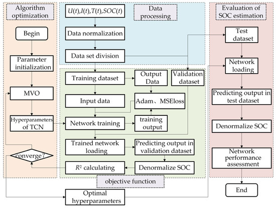 Data processing includes the techniques of data normalization and the division of datasets. The MVO algorithm is employed for optimizing the optimal hyperparameter solution of the TCN in algorithmic optimization. The objective function mainly implements the training and verification processes of deep learning. The network training uses the Adam optimizer, the loss function uses mean square error (MSE) loss, and the network verification uses the indicator R2 of Equation (4) for evaluation. The closer R2 is to 1, the more optimal its hyperparameters are, indicating superior performance of the training network. Finally, the optimized TCN is employed for SOC estimation, and the metrics are subsequently computed and evaluated using Equations (1)–(3).