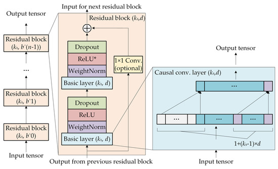 Figure 2 illustrates the basic architecture of the TCN. It is apparent that the TCN model is primarily constructed through the interconnection of residual blocks. These blocks comprise causal convolutions, dilated convolutions, weight normalization, rectified linear unit (ReLU) activation function, random dropout, and 1 × 1 convolution. The incorporation of a 1 × 1 convolution facilitates the transfer of network information across layers while maintaining consistency in input–output dimensions. The symbol “*” following ReLU indicates its presence in all layers except the final one, ensuring the potential for negative output values.