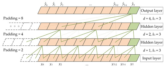 Figure 3 depicts a schematic of dilated causal convolution. Causal convolution is unidirectional, implying that the data in layer i at time k only depend on the data at or before time k in layer i − 1. The augmentation of network layers holds the potential to enhance the capabilities of acquiring long-range data. Dilated convolution refers to the insertion of gaps or holes within the conventional convolution operation, where the sampling rate is regulated by a dilation factor denoted as d. It achieves an increased receptive field by employing spaced sampling. With a larger dilation factor d, the convolutional output can capture information from longer temporal sequences without compromising information integrity. This method allows for a larger receptive field with fewer network layers. Meanwhile, n refers to the number of residual blocks, and b denotes the dilation base. It follows that d can be calculated as d = b(n−1). Zero-padding is necessary for each layer of the network due to the incorporation of holes in dilated convolutions. The padding amount p is determined by the convolution kernel size ks and satisfies the condition ks ≥ b, where p = (ks − 1) · d.