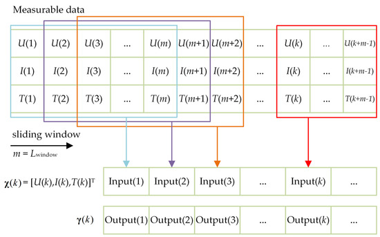The network employs a sliding window method to process the input data. Figure 4 presents the input and output data format schematic for the SOC estimation method. At time k, the vector = [U(k), I(k), T(k)]T denotes a vector consisting of the terminal voltage, current, and surface temperature of the battery, with indicating a vector of the estimated SOC.