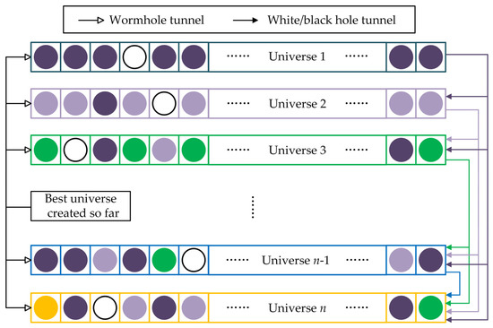 Figure 5 depicts the schematic diagram of the MVO algorithm. The inflation rate of the nth universe is represented by I(Un), as shown in Figure 5, where I(U1) > I(U2) > … > I(Un). In the establishment of tunnels connecting two universes, a universe characterized by a higher inflation rate is more inclined to accommodate a white hole, whereas a universe with a lower inflation rate is more likely to host a black hole. The transfer of objects from a universe with a high inflation rate to one with a low inflation rate is highly likely, thereby contributing to the overall average inflation rate of the universe during successive iterations.