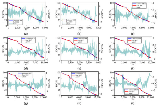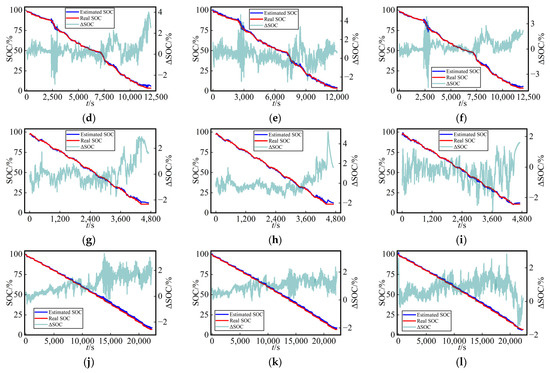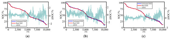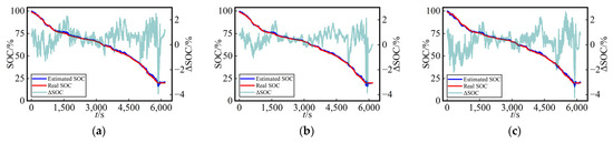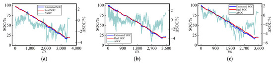 For a more straightforward assessment of the SOC estimation performance among the three methods in the test dataset, Figure 7 presents the curves of SOC estimation values and their errors (ΔSOC, calculated as the estimated value minus the true value) for the test dataset using three different networks at a fixed temperature (25 °C) with various dataset split methods. The SOC estimation curves and true SOC curves demonstrated a remarkably high level of consistency for the three methods employed, providing compelling evidence for the viability of this work.