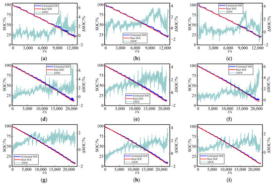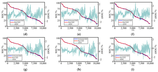 Curves of SOC estimation values and their errors for the UDDS in the test dataset using three different networks at various temperatures (0 °C, 10 °C, and 25 °C) with dataset split method B: (a) LSTM, (b) Transformer, and (c) TCN at 0 °C; (d) LSTM, (e) Transformer, and (f) TCN at 10 °C; (g) LSTM, (h) Transformer, and (i) TCN at 25 °C.