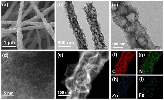 Micromorphology and structure of FeZn-PCNF. (a) SEM image, (b,c) TEM images, (d) HAADF-STEM image, and (e) STEM image and the corresponding EDS elemental mapping of (f) C, (g) N, (h) Zn, and (i) Fe.