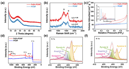 (a) XRD patterns, (b) Raman spectra, (c) N2 adsorption–desorption isotherms with the inset of the corresponding pore size distribution curves, (d) full XPS spectra of FeZn-PCNF and PCNF; and high-resolution XPS spectra of N 1s in (e) FeZn-PCNF and (f) PCNF.