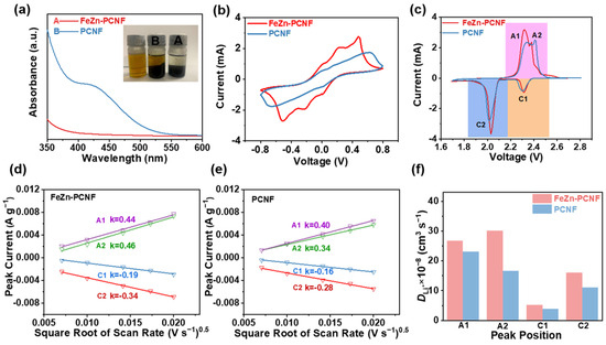 (a) UV-vis spectra and digital images of Li2S6 solution before and after adding FeZn-PCNF and PCNF absorbents, (b) CV curves of Li2S6 symmetric cells using FeZn-PCNF and PCNF electrodes, (c) CV curves of the FeZn-PCNF- and PCNF- based Li-S batteries at 0.1 mV s−1. Linear fitting of redox peak currents of the (d) FeZn-PCNF- and (e) PCNF- based Li-S batteries for Peaks A1, A2, C1 and C2, and (f) DLi values of the FeZn-PCNF- and PCNF- based Li-S batteries for peaks A1, A2, C1 and C2.