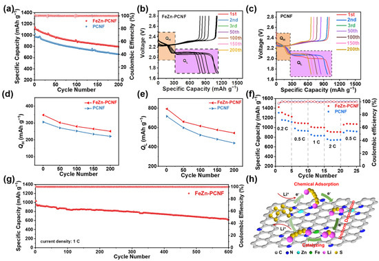 (a) Cycling performances of the FeZn-PCNF- and PCNF- based Li-S batteries at 0.5 C, GCD curves of the (b) FeZn-PCNF- and (c) PCNF- based Li-S batteries at different cycles, variation in (d) QH and (e) QL of the FeZn-PCNF- and PCNF- based Li-S batteries during cycles, (f) rate performances of the FeZn-PCNF- and PCNF- based Li-S batteries, (g) long cycling performance of the FeZn-PCNF-based Li-S battery at 1 C, and (h) schematic illustration of the work mechanism of FeZn-PCNF interlayer.