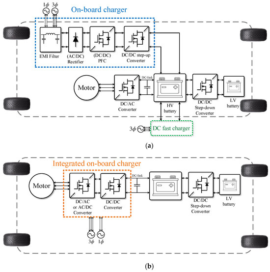 EV powertrain architecture with the high-voltage (HV) battery in the middle of the propulsion system: (a) non-integrated OBC; (b) integrated OBC.