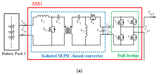 The single-phase and three-phase layout of the proposed integrated MSOBC is shown in Figure 1, where a battery pack is connected to an isolated SEPIC converter followed by a full-bridge converter in each submodule (SM) to regulate the battery current in case of charging or discharging. The battery pack is composed of ns lithium-ion (Li-ion) batteries in series and np in parallel. Because of its input inductor, the SEPIC converter will draw a constant current from the battery. The output capacitor of the SEPIC converter will filter the output voltage for the next stage of the H-bridge. As the SEPIC converter has an embedded high-frequency transformer (HFT), it can provide a sort of galvanic isolation between the battery pack and the motor in case of driving and the utility grid in case of charging.