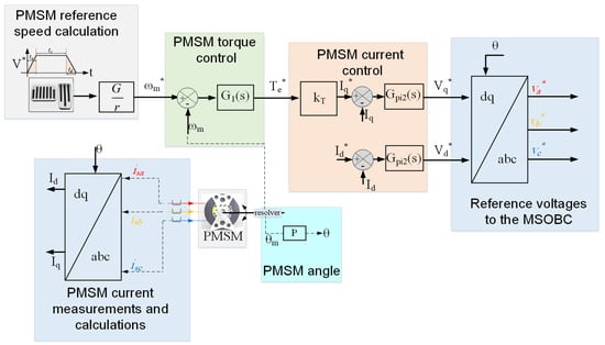 where Vd and Vq are the stator voltages expressed in dq coordinates, Id and Iq are the stator dq currents, ω is the electrical frequency of the stator voltage, ωm is the rotational speed of the motor, G is the gearbox’s ratio, Φr is the flux linkage of the PMSM, Rs is the stator windings’ resistance, Ld and Lq are the dq components of the stator windings’ inductance, Te is the developed electromechanical torque, and P is the number of pairs of poles.