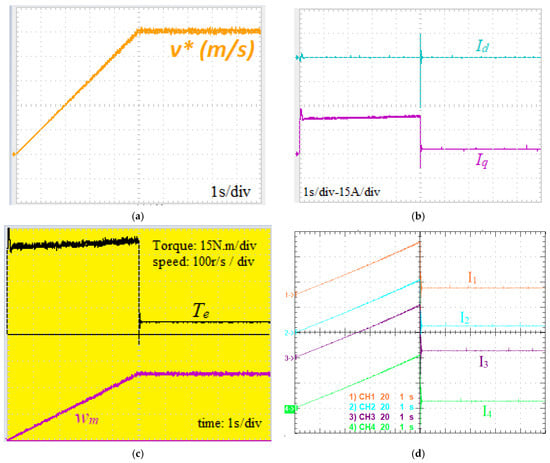 The speed is then controlled using the developed PMSM torque Te. As it is not simple to install torque sensors, another current control loop is employed to control Te indirectly using the q-axis current Iq, while the d-axis current Id is kept at zero. Finally, the currents of the PMSM are controlled by the three-phase voltage input which is generated by the MSOBC. To show the required overall voltages and current demanded by the MSOBC during the normal driving mode, the experiments in Figure 4 will be explained.