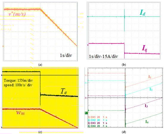The experimental results during the regenerative braking mode: (a) the velocity profile of the EV; (b) the dq-axis currents; (c) the PMSM’s rotational speed and electromagnetic torque; and (d) the currents through battery segments.