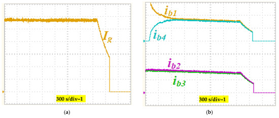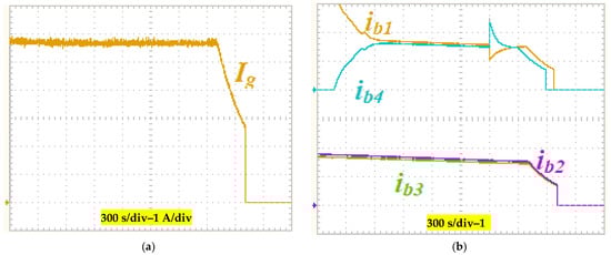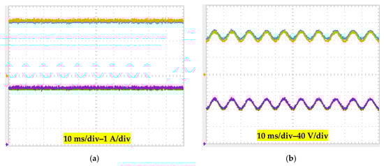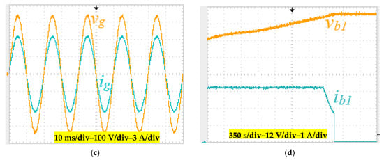 The experimental results during the charging mode (phase a): (a) battery segments’ currents; (b) dc-link voltages between the SEPIC and the full-bridge converters; (c) total input grid voltage and current; (d) the current through the first battery segment and the voltage across the first battery segment.