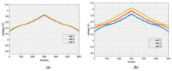 The experimental results for the voltage across three series cells (a) with similar initial SoC and (b) with 10% mismatch in the initial SoC.