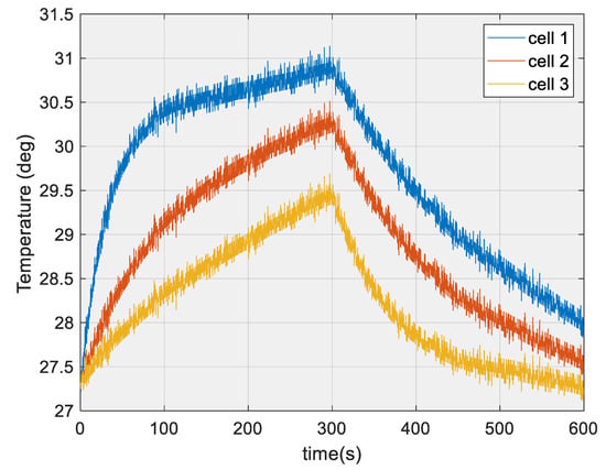 The experimental results: batteries’ temperatures for three series cells with 10% mismatch in initial SoC.
