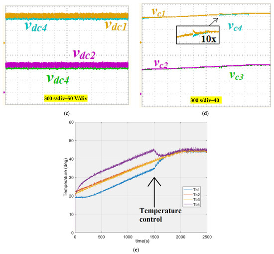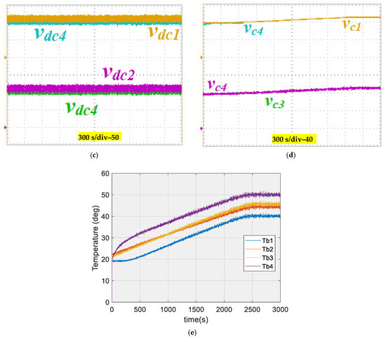 The experimental results during the charging mode after applying the control system for battery segments with different initial temperatures (phase a): (a) magnitude of the grid current; (b) the battery segments’ currents; (c) the dc-link voltages between the SEPIC and the full-bridge converters; (d) variations in voltage across the battery segments; (e) the battery segments’ temperatures.