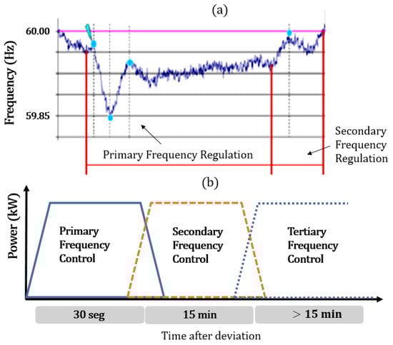 The power reserve intended for frequency regulation is defined seasonally by the energy control centers, and its compliance is mandatory for all generators, as is the reserve for the secondary regulation for generators that meet the necessary technical characteristics for this purpose. Figure 1b shows the classification of the times required for the different types of control depending on the established time [36].