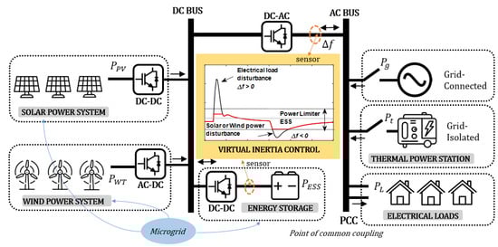 The fundamental architecture of virtual inertia control, as illustrated in Figure 2, primarily includes an energy storage system (ESS), an inverter, and a mechanism for inertial control. In this setup, inertia is artificially created by modulating the active power (W) via the inverter, which corresponds to the emulated speed of the rotor [37].