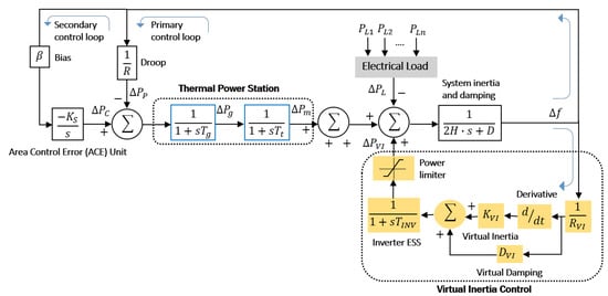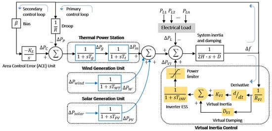 - The dynamic effects of generation–load interaction are smoothed out, while primary, secondary, and virtual inertia control blocks are implemented. This is developed without compromising the results according to the literature collected in each corresponding block.