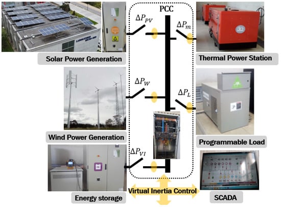 In the case study, a dynamic analysis of the solar-wind-diesel system is proposed with support in energy storage systems operated in island mode, considering the disturbances of renewable energies, in which the two perspectives are mainly analyzed regarding the response of the system without RES penetration and with RES penetration. The mathematical modeling and the parameters of the virtual inertia control were developed based on the characteristics of the renewable generation equipment and systems of the Centro Científico, Tecnológico y de Investigación Balzay (CCTI-B) of the University of Cuenca [26,40]; they are presented in the following Figure 4. The laboratory mainly consists of a photovoltaic generation system (35 kW), a mini wind farm (15 kW), a diesel generator (40 kVA), storage systems with Valve-Regulated Lead-Acid (VRLA) Gel battery bank (15 kWh), and a programmable electrical load that allows for the creation of step scenarios every 5 kW. The microgrid systems are connected at a Point Common Connection (PCC) on the bus in island mode as described below.