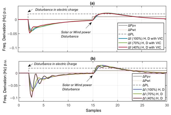 Frequency response wind and solar penetration (a) virtual inertia control and (b) virtual dropping.