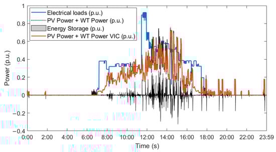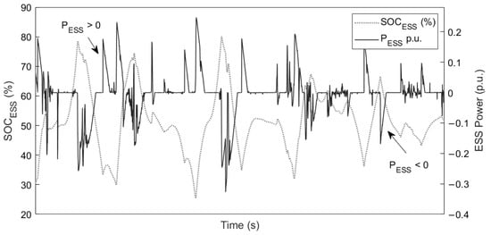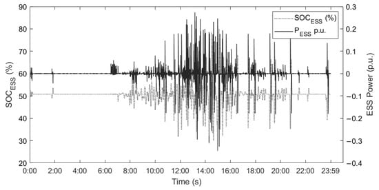 According to Equations (10)–(12), the reference power for the storage systems and the variation of their can be seen in the following Figure 12 and Figure 13. In this context, the contribution of ESS in the grid is required only in the penetration of RES with high intermittency values, thus improving network stability. The reference values for the ESS are controlled by the connection/disconnection of RES and the connection/disconnection of electrical loads. This generates positive and negative values that allow one to maintain adequate SOC levels.