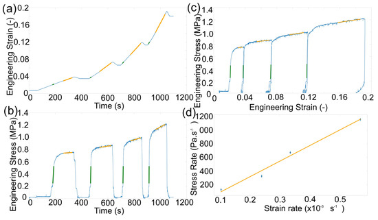 (a) Engineering stress vs. time during compression with four different strain rates with linear fitting of the elastic regions (green) and where the material behaves plastically (orange). (b) Engineering strain vs. time during compression with a linear fit of the same regions relating to the plastic deformation. (c) Engineering stress vs. strain plot. (d) The resultant plot of the engineering stress rate vs. engineering strain rate during plastic deformation, where standard error in strain rate is shown by the marker size and the error in stress rate is provided by vertical bars.
