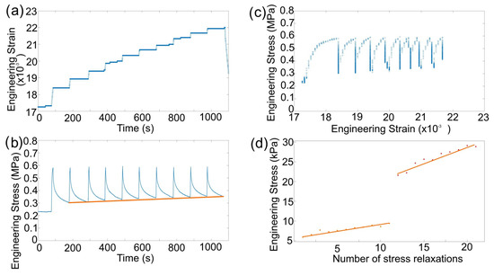 (a) A typical set of ten 100 s constant strain tests showing elastic loading and stress relaxation. The orange line connects the stress value after 100 s of each test as a guide for the reader. (b) Engineering stress vs. strain of the stress relaxations and (c) the step loading and strain hold segments. (d) Increase in athermal stress after successive 100 s stress relaxations, first set with an initial stress of 0.3 MPa and the second with an initial stress of 0.6 MPa. The orange line represent the linear fit of each data set.