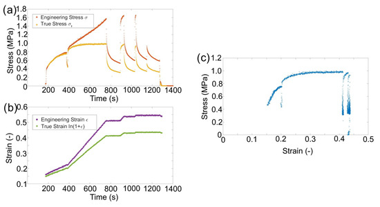 (a) Compressive strain of a sample with time. (b) Geometrically corrected stress evolution with different strain rates showing that a flow state occurs and the real stress relaxation. An initial loading of 0.2 mm/min (200–400 s) equating to a strain rate of ∼3 followed by an increased displacement rate of 0.5 mm/min equating to ∼6 (≥400 s). (c) The true stress plotted against true strain.