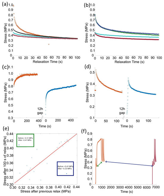 The amount of relaxation in 100 s, shown in Figure 3a, was similar ( = 0.64, 0.64, and 0.59 MPa for the first three holds) and loading to half the initial stress caused a significantly smaller stress reduction in 100 s ( = 0.29 MPa), but reached a similar absolute value of 0.33 MPa that was related to the athermal stress in the material (Figure 3b).