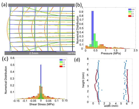 (a) The extracted FEA element edges (from Figure A11) for samples under 50% compression with different values (blue 0.01, green 0.1, yellow 0.5, and red 0.9), (b) the distribution of hydrostatic stress magnitudes from FEA nodes, and (c) the distribution of shear stresses from FEA nodes. In the histograms (b,c), regions where bars overlap are denoted with a striped fill. The values for (a–c) are 0.01 blue; 0.1 green; 0.5 yellow; and 0.9 red. (d) shows minimal barrelling in the edge profile of a sample before testing (blue) and after a 20% compression (red) as extracted from images using Appendix A.3, scale 64 pixel per μm.