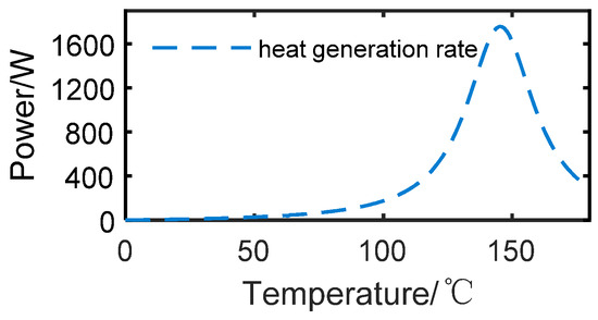 The thermal runaway side-reaction heat generation described above occurs significantly only when the battery temperature surpasses 80~100 °C. Consequently, it becomes imperative to model the catalytic heat, , associated with thermal runaway before the temperature rises from ambient conditions to initiate the side reaction.