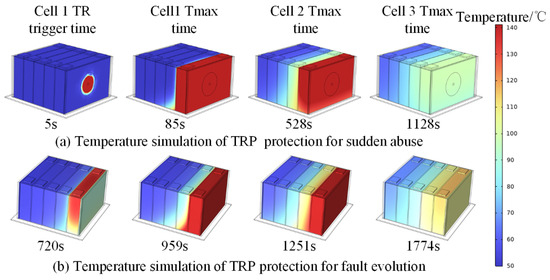 The temperature distribution of the battery module was mapped with 50 °C as the lower boundary and 141.2 °C as the upper boundary. The three-dimensional temperature distribution cloud map in Figure 11 illustrates that the incorporation of aerogel protection prevents TRP within the battery module. Under both sudden abuse and fault evolution triggering, the highest temperatures of cell 2 are around 100 °C and 120 °C, respectively, below the TRP threshold. Therefore, TRP did not occur in the battery module.